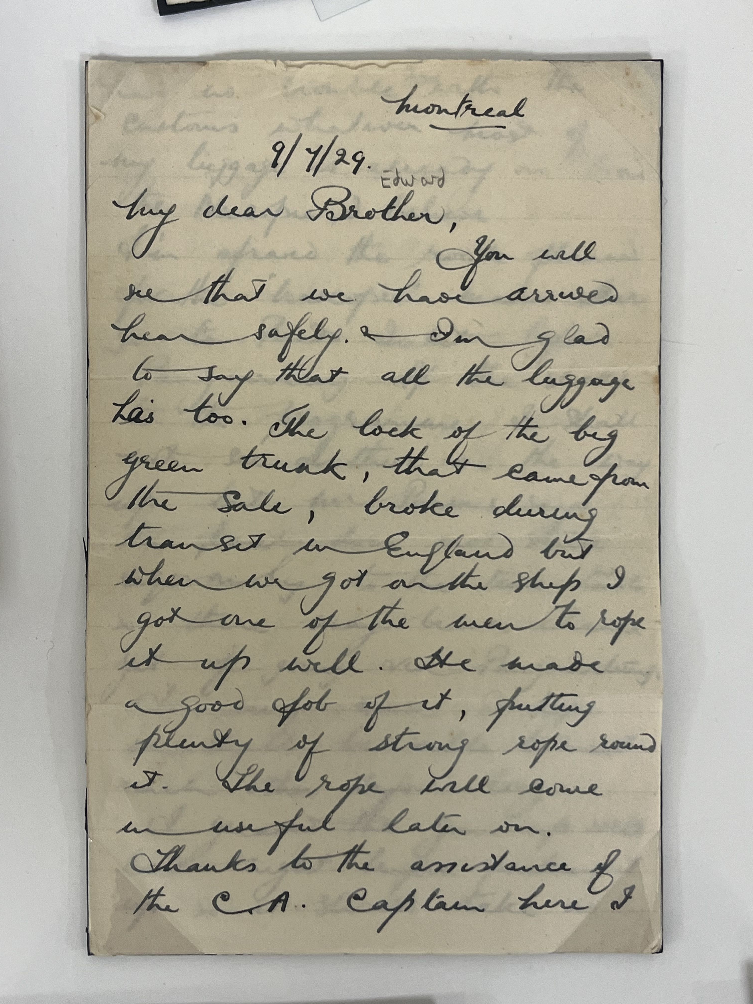 You will see that we have arrived here safely and I'm glad to say that all the luggage has too. The lock of the big green trunk, that came from the sale, broke during transit in England but when we got on the ship I got one of the crew to rope it up well. He made a good job of it, putting plenty of strong rope around it. The rope will come in useful later on. Thanks to the assistance of the C. A Captain here. J"