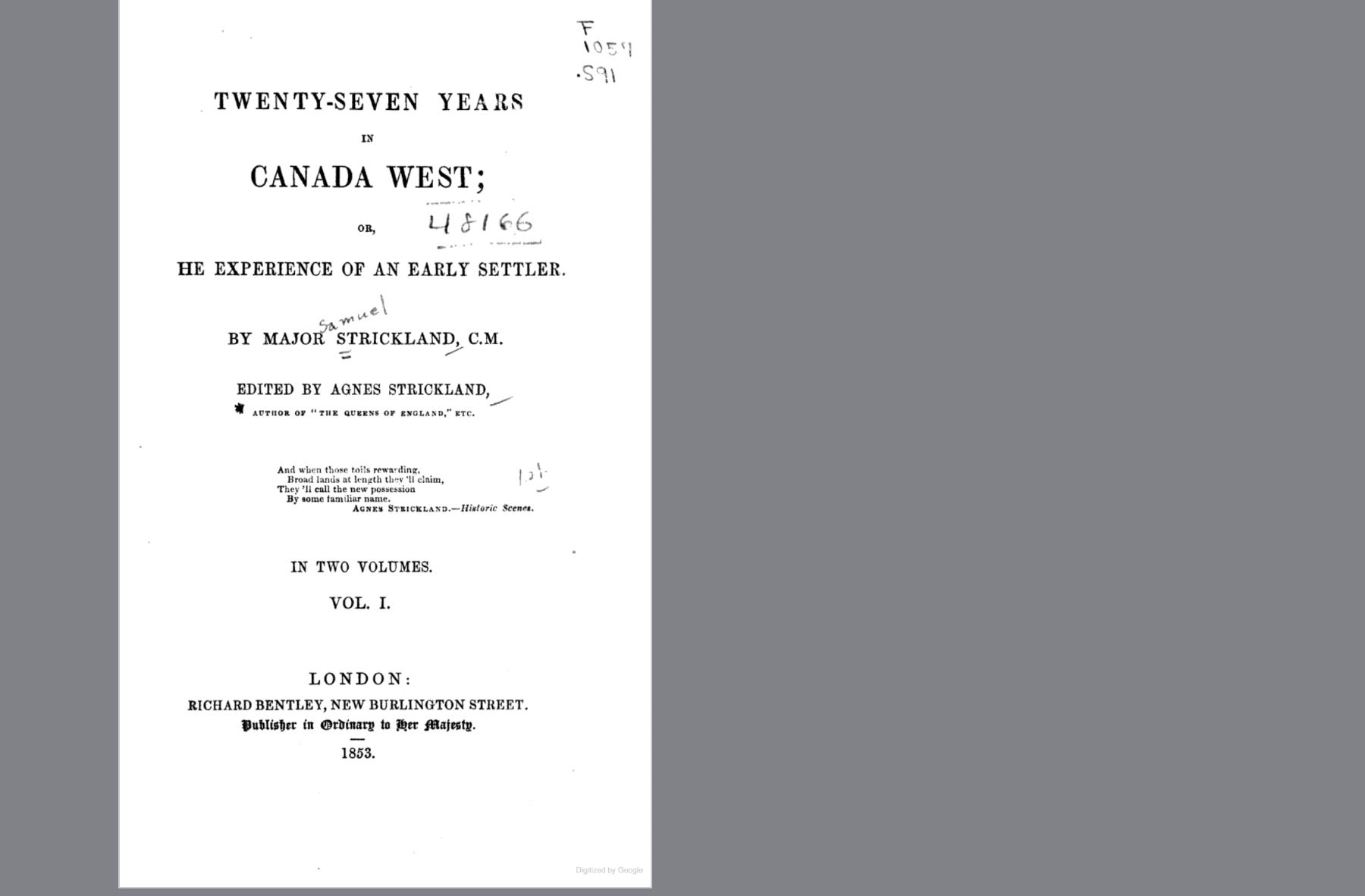 Meanwhile, Samuel Strickland was sponsored by family friend Colonel Black and went off to pursue a pioneer's life in Canada. As a result, by the 1830s Susanna and Catharine both emigrated to Canada, in the search for riches and comfort, though each of them had very different experiences once there.